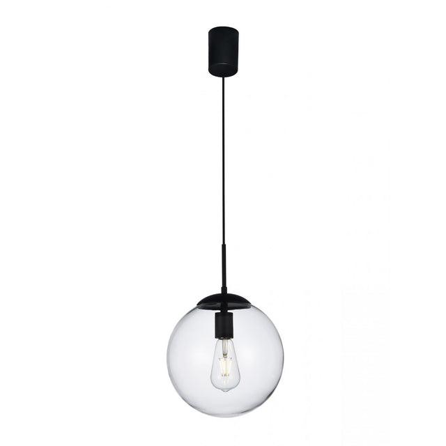 Lustra suspendată Global aduce un accent modern și discret, cu corp din metal vopsit negru mat și glob din sticlă suflată transparentă. Diametrul de 25 cm o face ideală pentru insule de bucătărie, holuri sau grupată în compoziții deasupra mesei. Designul clar pune în valoare becul ales și oferă o lumină plăcută, bine direcționată.