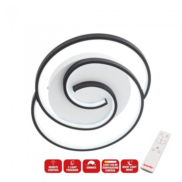 Plafonieră LED Intersia 01-2757, negru, 38W, 2030 lm, 3000K/4500K/6500K, Ø48 cm, IP20. Structură din metal vopsit alb cu brațe spiralate negru mat și dispersoare din silicon opal pentru lumină uniformă. Telecomandă inclusă: on/off, reglaj intensitate, schimbare temperatură de culoare, timer și mod lumină de veghe—ideală pentru interioare moderne.
