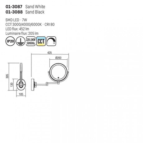 Aplica LED Selfie, alb mat, 7W, 205lm, 3000K-4000K-6000K, IP20, Smarter, 01-3087