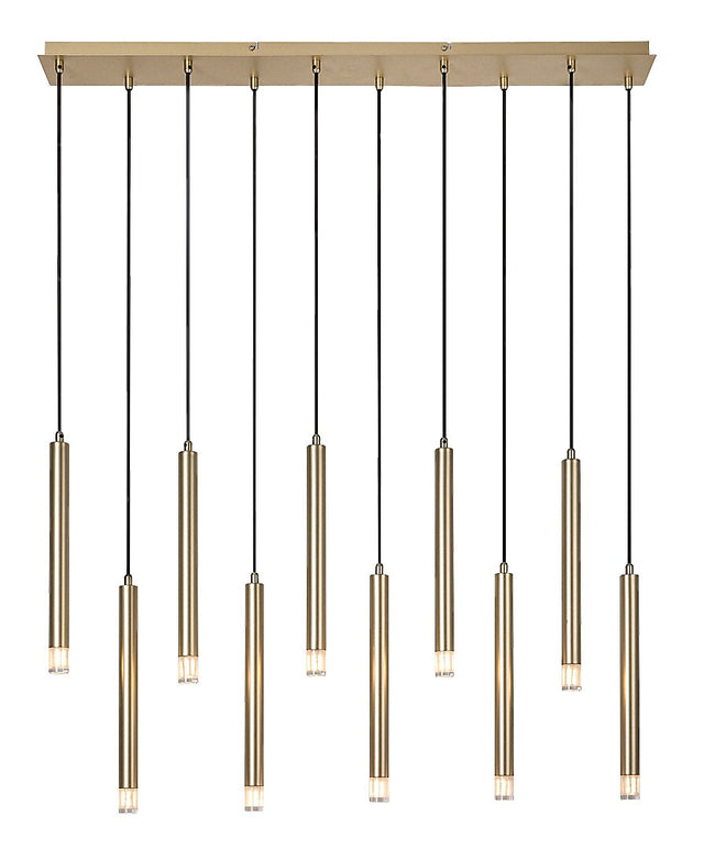 Lustra suspendata Ramira, este recomandată în special celor care caută un corp de iluminat suspendat în stil minimalist, dar cu dimensiuni impresionante și intensitate luminoasă ridicată. Lustra este realizată din metal de culoare aurie elegantă și este completată de abajururi din acril transparent și o bază decorativă lungă și pătrată în aceeași culoare ca și capetele lămpii. Capetele lustrei, de diametru mic, sunt realizate într-o formă tubulară, cilindrică și sunt aranjate în linie, una lângă cealaltă. Capetele lustrei sunt suspendate la înălțimi diferite, oferind acestui model un aspect unic. Lustra suspendată este ideală nu numai pentru living, ci și pentru bucătărie, sufragerie sau dormitor. Poate fi utilizată cu zece becuri, fiecare cu o putere de până la 5 W. Tipul de soclu este G9. Lustra este livrată fără surse de lumină.