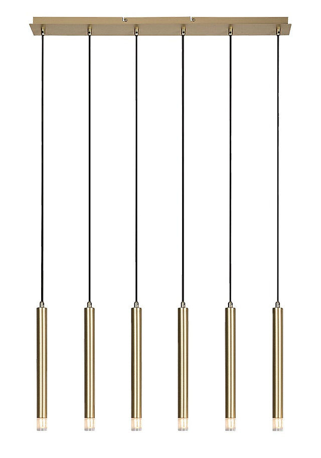 Lustra suspendată Ramira este alegerea ideală pentru cei care caută o lampă suspendată modernă și minimalistă, care poate fi integrată cu ușurință în aproape orice încăpere din casa lor. Lampa este realizată din metal de culoare auriu elegant și este completată de abajururi transparente din acrilic și o bază decorativă lungă, pătrată, de aceeași culoare cu capetele lămpii. Capetele lămpii cu diametru mic sunt realizate într-o formă tubulară, cilindrică și sunt aranjate într-un rând, una lângă alta. Acest model universal este recomandat nu doar pentru living, bucătărie și sufragerie, ci și pentru dormitor. Lustra poate fi utilizata cu șase becuri, fiecare cu o putere de până la 5 W. Tipul de soclu este G9. Poți alege surse de lumină care emit lumină albă caldă sau naturală. Lustra suspendată cu 6 becuri este furnizată fără surse de lumină.