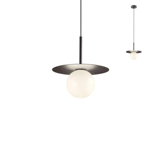 Suspensie pentru interior, structura din metal vopsita negru mat, dispersor din sticla suflata opal.