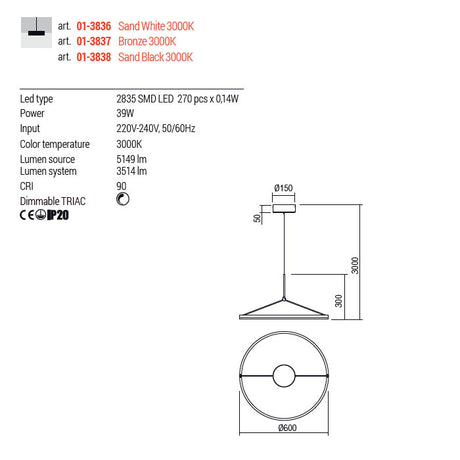 Lustra suspendata LED Orbit, negru mat, 39W, 3514lm, 3000K, D.60 cm, IP20, Redo, 01-3838