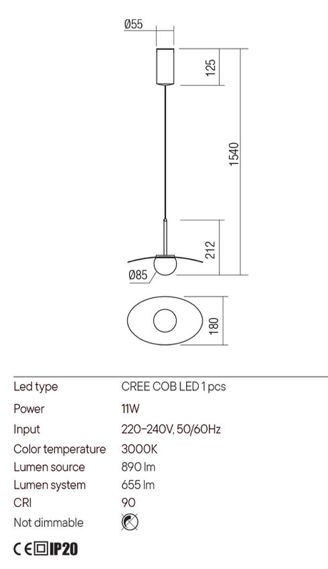 Lustra suspendata LED Cody, negru, 11W, 655lm, 3000K, IP20, Redo, 01-3289