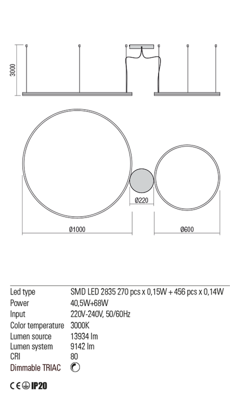 Lustra suspendata LED Orbit, alb mat, 40.5W + 68W, 13934lm, 3000K, IP20, Redo, 01-1720-TRIAC