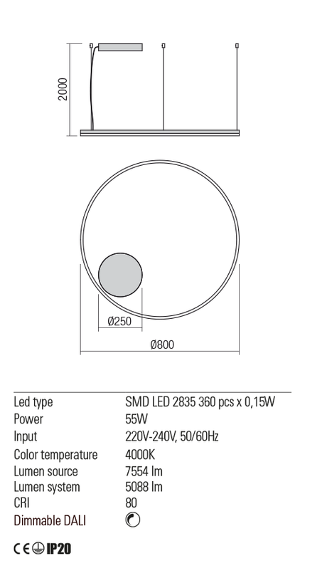 Lustra suspendata LED Orbit, alb mat, 55W, 7554lm, 4000K, IP20, Redo, 01-1914-DALI