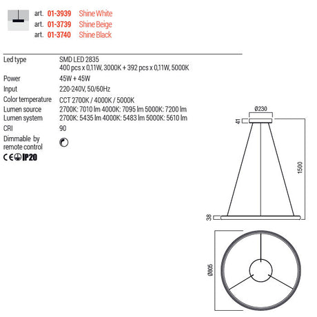 Lustra LED Vance, alb, 90W, 7200lm, 2700K, 4000K, 5000K, telecomanda, D.80cm, IP20, Redo, 01-3939