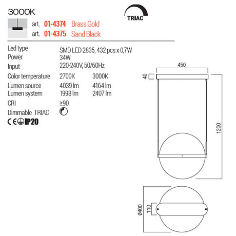 Lustra suspendata LED Atlas, alama, 34W, 2407lm, 3000K, D.40cm, IP20, Redo, 01-4374
