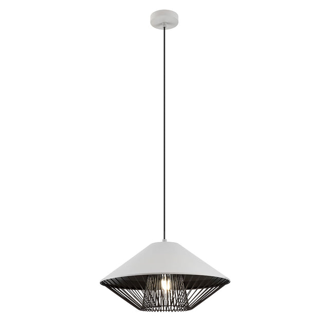 Suspensie pentru interior, structura din metal vopsit negru mat, dispersor din aluminiu vopsit alb mat la exterior si negru mat la interior, grilaj decorativ din metal vopsit negru mat.