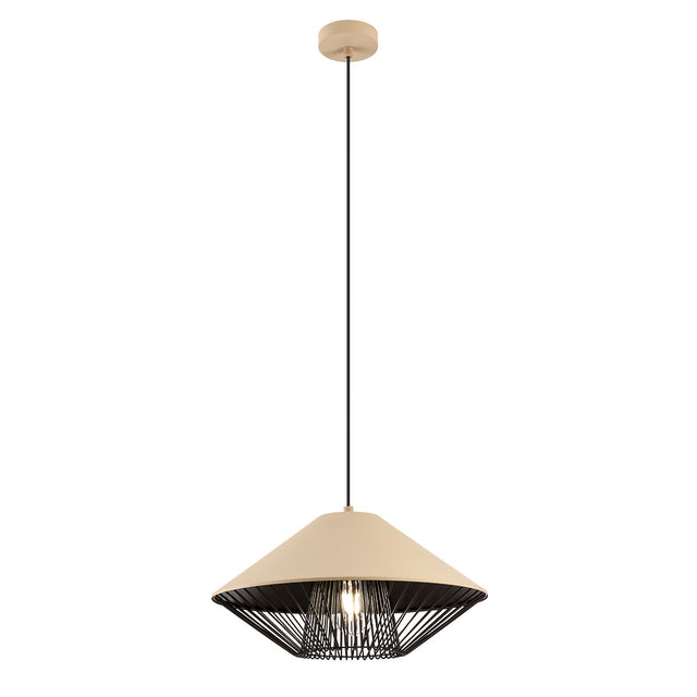 Suspensie pentru interior, structura din metal vopsit negru mat, dispersor din aluminiu vopsit bej mat la exterior si negru mat la interior, grilaj decorativ din metal vopsit negru mat.