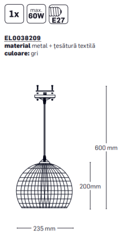 Lustra suspendata Amno, fumuriu, 1xE27, IP20, Redo, 01-1773