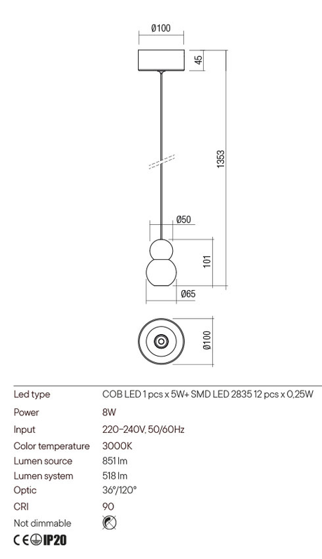 Lustra suspendata LED Aoba , alb mat, 8W, 851lm, 3000K, IP20, Redo, 01-2692
