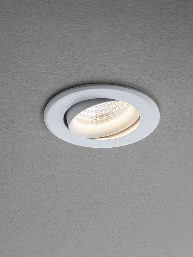 Spot de incastrat orientabil, echipat cu LED COB, structura din aluminiu vopsita in camp electrostatic alb mat, reflector din aluminiu oglindat si dispersor din policarbonat. Complet echipat cu alimentator.