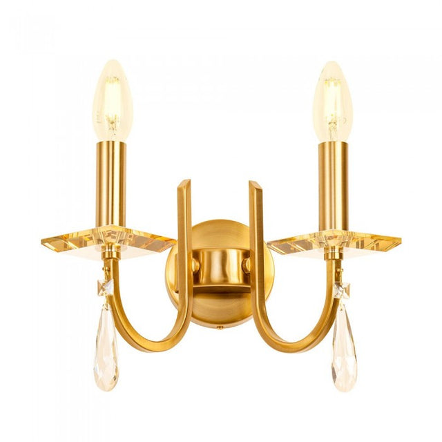 Aplică clasica pentru interior, cu structură din metal finisat alamă, elemente decorative din sticlă transparentă și pandative din cristal.