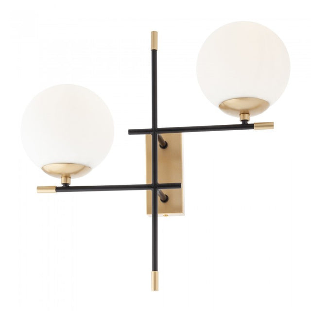Aplica moderna pentru interior, cu structura din metal finisat auriu mat cu elemente vopsite negru mat si abajururi din sticla alb opal.