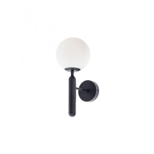Aplica moderna pentru interior, cu structura din metal vopsit negru mat, si dispersor din sticla suflata opal.