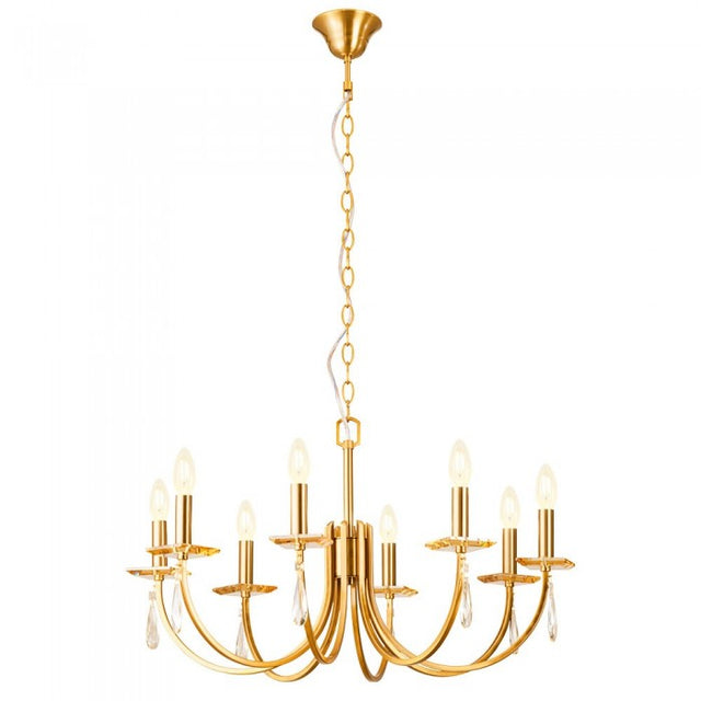 Candelabru pentru interior, cu structură din metal finisat alamă, elemente decorative din sticlă transparentă și pandative din cristal.